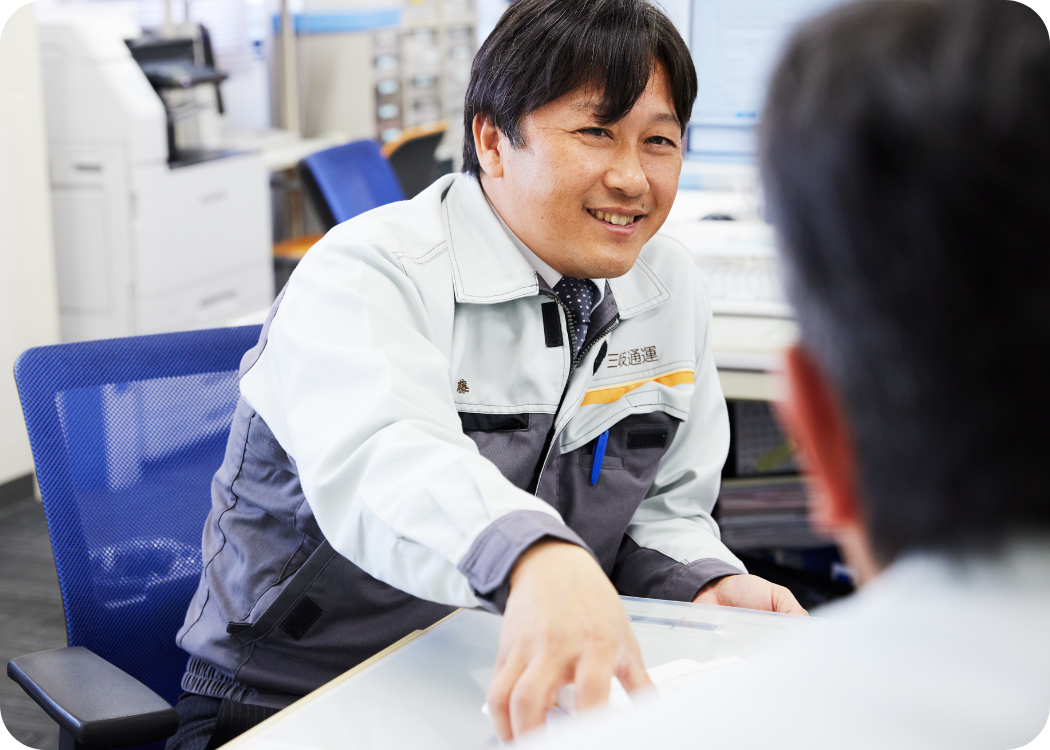 協力会社を合わせて約130台のトラック・乗務員が毎日、無事にお客様の荷物を安全に輸送できるよう、日々の運行管理や運行指示、お客様との調整を行っています。また、管理職として事務職員の教育指導を行っています。やりがいは、お客様から「ありがとう」の言葉を頂いたときに喜びを感じます。また、全乗務員が無事に1日の業務を終え事務所に帰ってきた際に顔を合わせて「お疲れ様」の挨拶をするときに「今日も1日やり切ったな!」という気持ちになります。